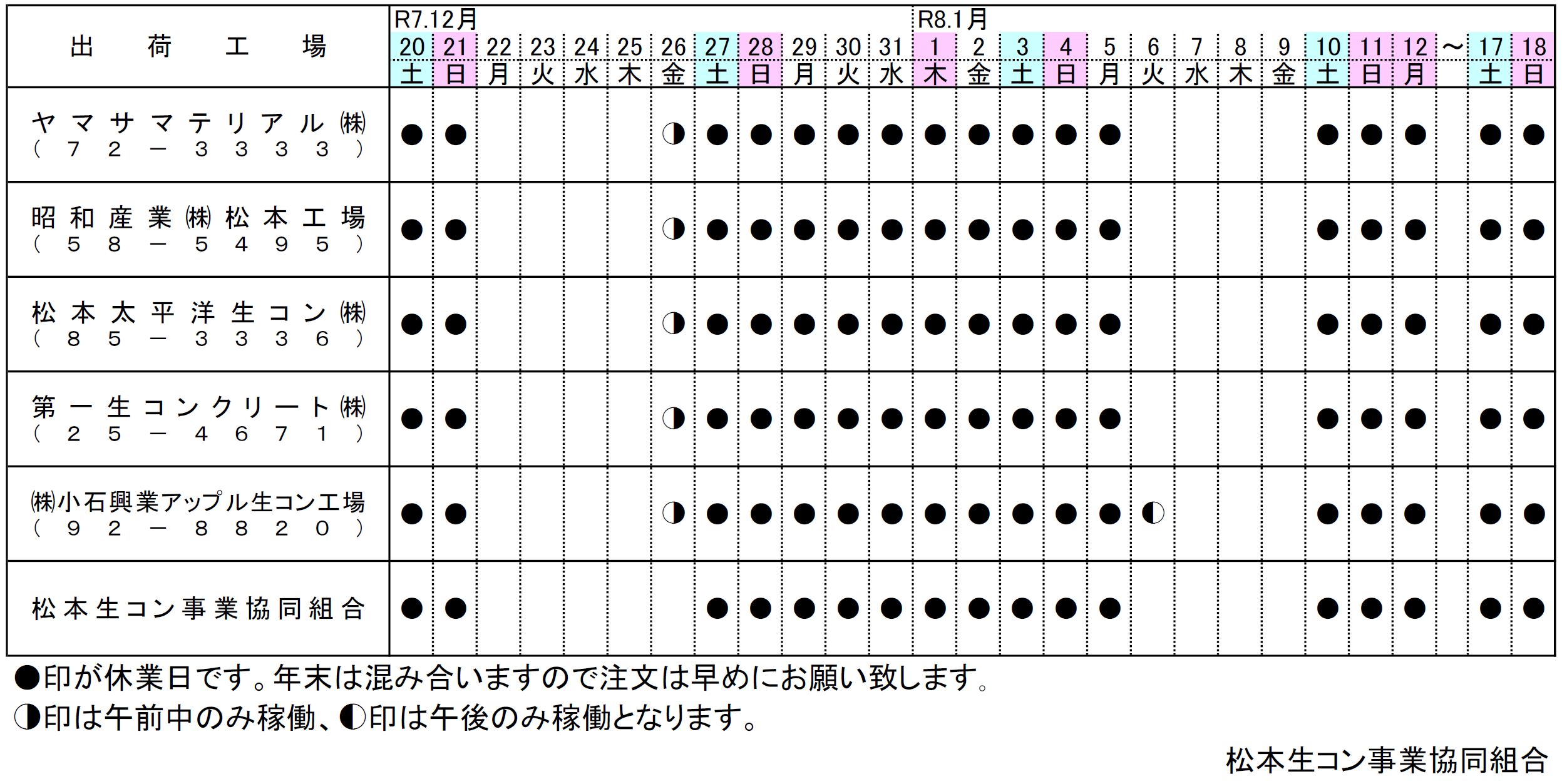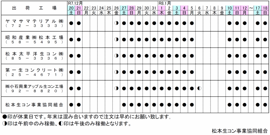 年末年始休業日のお知らせ 公開日:2025年11月19日 未分類 初冬の候、皆様方には益々御清栄のこととお喜び申し上げます。日頃は一方ならぬ御愛顧を賜り厚く御礼申し上げます。さて、年末年始は下記表の様に休業させて頂きますので宜しくお願い申し上げます。 投稿ナビゲーション 【令和8年4月より】現場での「残コン※」処理費用有償化について